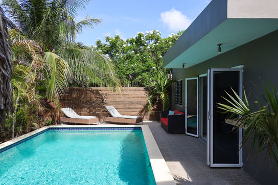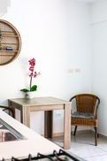 Dit appartement is direct naast het zwembad gevestigd. Het appartement is circa 60m2 en beschikt over een knusse woonkamer met zitje en een volledig ingerichte, open keuken met onder andere een grote koelkast met vriesgedeelte, een gasfornuis en een koffieapparaat. Het appartement beschikt over twee ruime slaapkamers, beide voorzien van een 2-persoonsbed, een kledingkast, een airco en ventilatoren voor een fijne koele bries bij het slapen. De ramen in de slaapkamers zijn voorzien van shutterramen met muggenhorren zodat je overdags heerlijk de ramen open kunt zetten. Beide slaapkamers delen één badkamer met warme douche, een toilet en wastafel. Tevens beschikt het appartement over een zeer ruim dakterras waar u heerlijk kunt genieten van de zon.